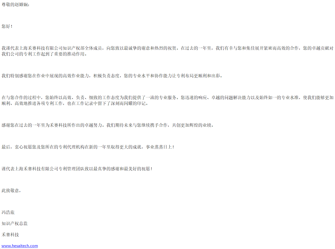 禾赛科技有限公司知识产权总监冯浩旅致感谢信,称赞上海分所代理人赵嫭娴与赵景平以高效、负责、细致的工作态度为客户提供了一流的专业服务,在合作中展现了卓越的问题解决能力以及始终如一的专业水准,协助客户顺利、高效地推进各项专利工作。期待未来与集佳继续携手合作,共创更加辉煌的业绩。
