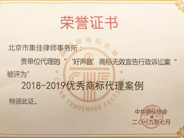 >雷速官网>关于我们>荣誉概览>2019>集佳代理“好声音”商标无效宣告行政案入选“优秀商标代理案例”