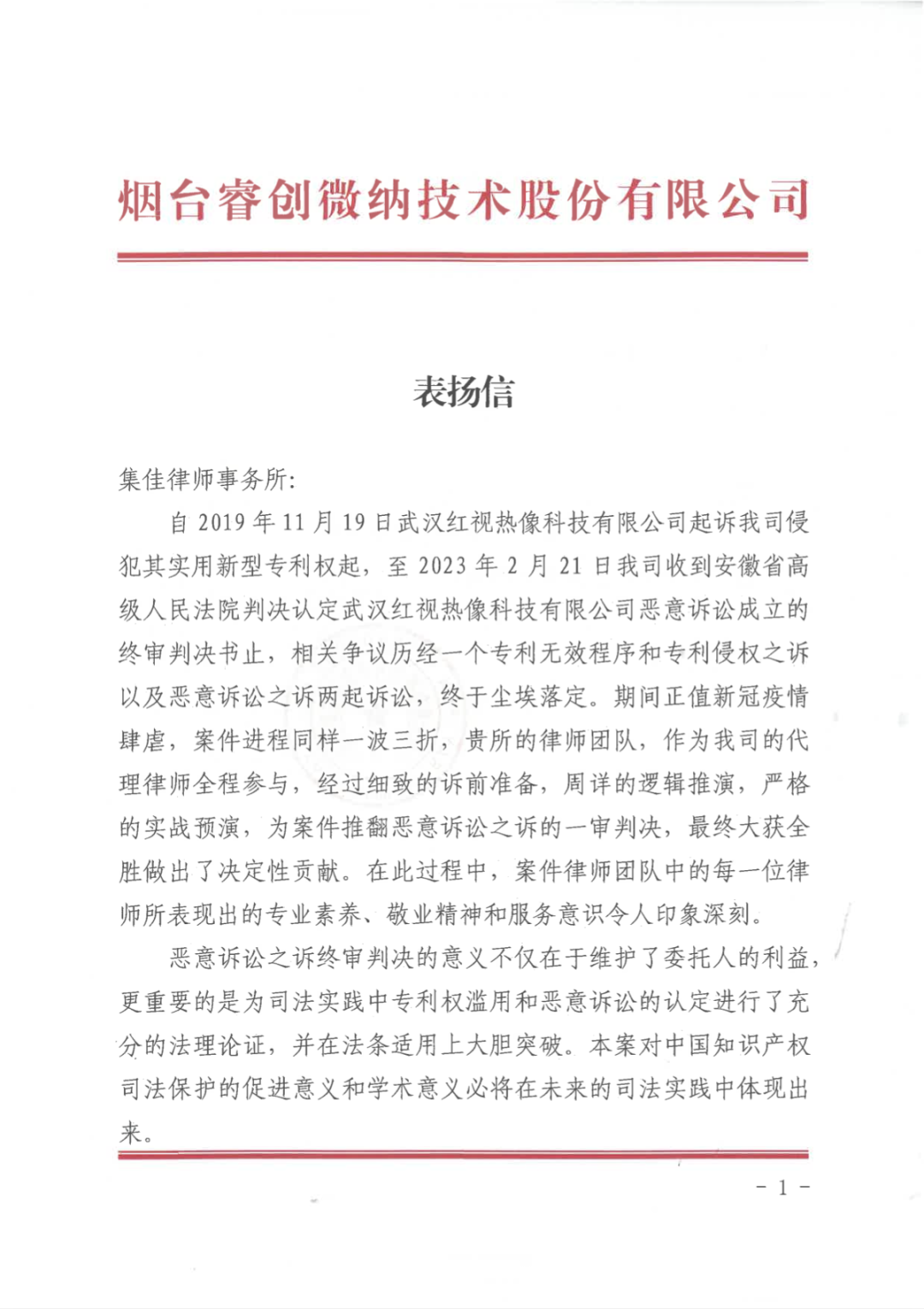 2023年2月10日,安徽省高级人民法院就烟台睿创微纳技术股份有限公司、烟台艾睿光电科技有限公司、安徽英睿系统技术有限公司等(下称“睿创集团”)与武汉红视热像科技有限公司(下称“武汉红视”)因恶意提起知识产权诉讼损害责任纠纷一案作出终审判决,认定武汉红视滥用诉权的行为构成恶意诉讼,并判令其赔偿睿创集团相应的合理支出。至此,时隔四年,横跨疫情时代的专利侵权及恶意诉讼系列纠纷案,终于尘埃落定。雷速官网协助睿创集团最终取得系列案件的全面胜利,维护了客户合法权益,实现了商业竞争的公平正义!
