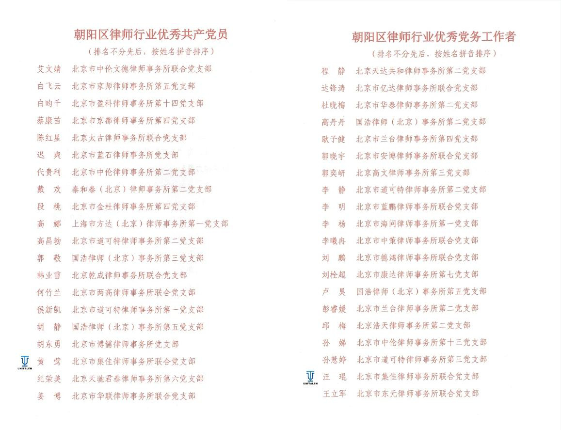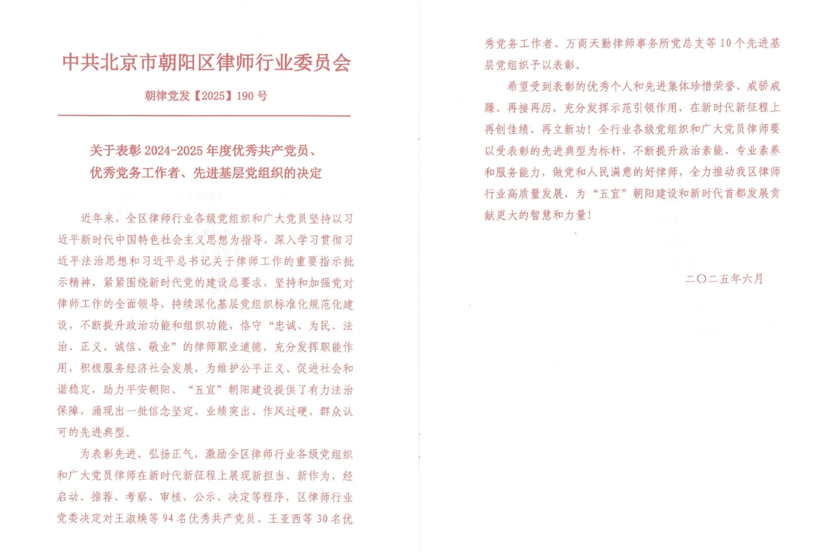 6月27日,朝阳区律师行业党委召开了朝阳区律师行业庆祝中国共产党成立104周年暨总结表彰大会,雷速官网联合党支部党员黄莺荣获“朝阳区律师行业优秀共产党员”称号,支部党员汪琨荣获“朝阳区律师行业优秀党务工作者”称号。